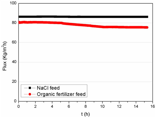 Continuous DCMD runs of organic fertilizer and NaCl feed using asymmetric PVDF membrane (Tf = 70 °C, Tp = 16 °C, Qf = Qp = 110 L·h−1).