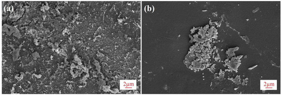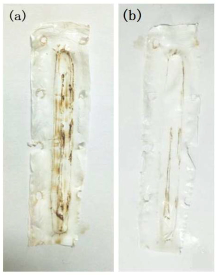 As a result of the 15-h continuous operation of the organic fertilizer, flux decline was observed. This may be due to the reduction in vapor pressure of the feed solution and hence the transmembrane driving force as concentration increased. Also, the build-up of the fouling layer on the surface of the PVDF membrane could cause further flux decline, as evidenced by the surface inspection by SEM in Figure 8 and Figure 9. To reveal the fouling behavior of the PVDF membrane, surface inspection was carried out. Figure 8 shows the SEM images of the fouled membrane (a) and the cleaned membrane rinsed with pure water (b). Correspondingly, Figure 9 shows pictures of the fouled (A) and cleaned membrane (B). As shown in Figure 8a and Figure 9a, the entire surface of the PVDF membrane was covered by a layer of amorphous deposition, which has the same dark brown color as the fertilizer feed; the fouling layer was almost completely removed through clean water rinsing, as shown in Figure 8b and Figure 9b. The easy cleaning of the membrane after 15 h of running may be attributed to the unique dense and smooth top surface structure of the asymmetric PVDF membrane.