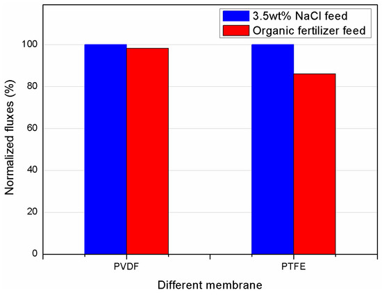 Comparison of initial normalized fluxes of as-prepared asymmetric PVDF and commercial PTFE membrane with synthetic and organic fertilizer (Tf = 70 °C, Tp = 16 °C, Qf = Qp = 110 L·h−1).
