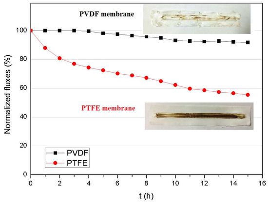 The comparison of normalized fluxes of the asymmetric PVDF and commercial PTFE membrane was further investigated with an organic fertilizer feed in a 15-h continuous operation. The results are shown in Figure 11, in which the normalized flux of the PVDF membrane exhibits a very slow and minor decrease of 8% and remains relatively constant after a 15-h continuous operation. In contrast, a rapid decrease was observed with the PTFE membrane, resulting in 56% flux decline after 15 h. This could be due to the quick build-up of the fouling layer on the surface of the PTFE membrane, which exhibits a rough and fibrous surface structure, as indicated in Figure 2. Pictures of the fouled membranes after the 15-h operation are given in Figure 11: the deposit on the smooth surface of the PVDF membrane (top picture) was minor and relatively loose, while the cake layer on the PTFE membrane was dense.
