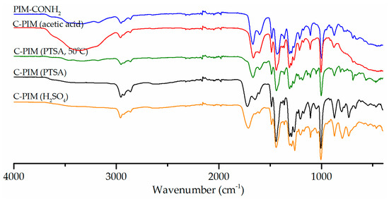A unique class of microporous organic material (i.e., Polymers of Intrinsic Microporosity (PIMs)) was first developed by Budd and McKeown in 2004 [9]. Since the chemical structures and physical properties of the membrane materials influence their corresponding permeability and permselectivity, various new PIM structures and synthetics methods have been reported, in order to improve the gas separation performance [10,11,12,13,14,15]. The nitrile (–CN) group of PIM-1 is the most popular target for transformation, and has been converted to various CO2-philic functionalities such as nitrogen-containing groups [16,17,18,19,20,21,22] and carboxylic acid-based functional groups [23,24,25,26,27,28,29,30]. Carboxylate functionalised PIMs (C-PIMs) were inspired by the well-known carboxylic acid-containing polyimide based on the 6FDA-DABA, which exhibits superior gas separation performance after decarboxylation and/or crosslinking [31]. The first synthetic attempt toward C-PIM was reported in 2009 [24]. The synthesis was based on hydrolysis of the nitrile group under alkaline conditions. The resultant polymer showed an overall increase in permselectivity and decreased permeability [24]. However, in 2014, Satilmis et al. pointed out that the base-hydrolysed PIM-1 materials contained a mixture of amide, carboxylic acid, ammonium carboxylate and sodium carboxylate functional groups where the actual percentage of carboxylic acid was less than 20% [32]. Even after extensive base-hydrolysis, only 51% carboxylation was achieved [32]. In 2017, Santoso et al. reported a critical update on the characterisation of C-PIM [33]. Based on the spectroscopic data obtained from FT-IR, 1H NMR, 13C NMR, and 1H-15N HSQC, the amide and carboxylic acid groups were unambiguously distinguishable. The multiple proton signals between 7.0–8.5 ppm in 1H NMR were correctly assigned to the active amide protons (–C(=O)-NH2) whereas the carboxylic acid proton (–C(=O)-OH) is located further downfield in the range of 13.0–14.0 ppm. Moreover, the carbonyl stretch vibration at 1666 cm−1 observed by FTIR belongs to the amide carbonyl, whereas the carboxylic acid carbonyl stretch is located at 1720 cm−1 [33].