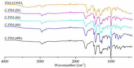FTIR spectra of reaction of PIM-CONH2 with NaNO2 and H2SO4 in MeCN at 90 °C at reaction times from 2–48 h.