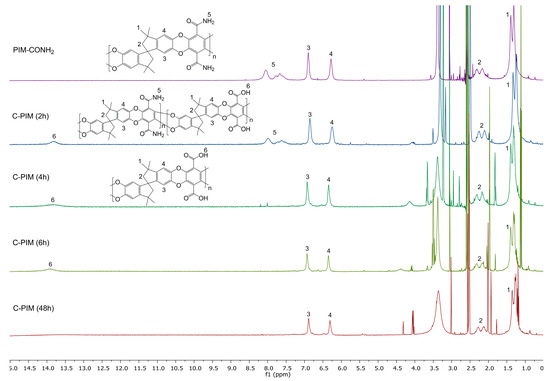 The 1H NMR spectra were also used to probe the reaction kinetics. Figure 4 compares the 1H NMR spectra of PIM-CONH2, C-PIM (2 h), C-PIM (4 h), C-PIM (6 h) and C-PIM (48 h) samples. For PIM-CONH2, multiple peaks are observed at 7.0–8.5 ppm which are due to the four active amide (–C(=O)NH2) protons. For the C-PIM (2 h) sample, both amide and carboxylic acid (–C(=O)OH) proton resonances in the 13.0–14.0 ppm region were present. As the reaction progressed to 4 h, the amide proton region (7.0–8.5 ppm) turned to flat baseline. After 6 h reaction time, there were no obvious changes in 1H NMR spectra, consistent with the FTIR results. We therefore concluded that the conversion was complete after 6 h.