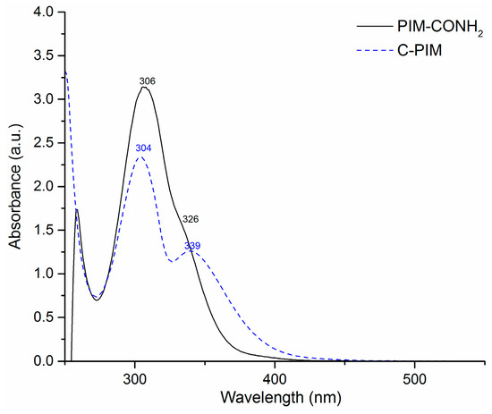 The UV-Vis spectra of PIM-CONH2 and C-PIM with same concentration (0.1 mg/mL) are shown in Figure 5. For the starting polymer PIM-CONH2, the absorption maximum (λmax) was at 306 nm corresponding to the π-π* transition while the shoulder peak at 326 nm corresponds to the n-π* transition of the carbonyl group. For the product polymer C-PIM, λmax at 304 nm corresponds to the π-π* transition and λmax at 339 nm arise from the n to π* transition. A red shift of about 13 nm was observed for the n-π* transition (–C=O) of C-PIM compared to that of PIM-CONH2. This indicated that the energy gap between n orbital and π* orbital for C-PIM was smaller than that of PIM-CONH2.