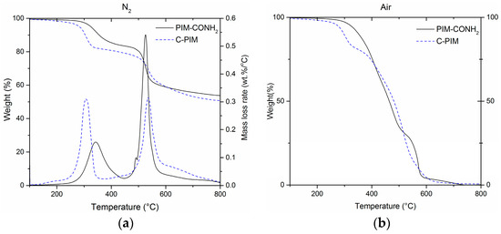 (a) Thermogravimetric analysis of PIM-CONH2 and C-PIM at 10 °C/min under N2 atmosphere. The left axis marks weight loss change in % and the right axis marks mass loss rate in wt. %/°C; (b) Thermogravimetric analysis of PIM-CONH2 and C-PIM at 10 °C/min under air atmosphere.