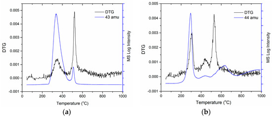 Thermogravimetric analysis combined with mass spectroscopy (TGA-MS). (a) DTG curve of PIM-CONH2 overlaid with MS trace of m/z 43 amu and (b) DTG curve of C-PIM overlaid with MS trace of m/z 44 amu.