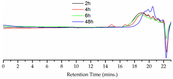 GPC chromatograph showing molecular weight change of C-PIM at different reaction times from 2 h to 48 h using THF as eluent.