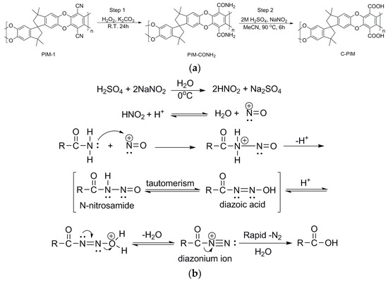 (a) Two-step synthesis of C-PIM via PIM-CONH2. (b) Proposed reaction mechanism for the conversion of amides to carboxylic acid using nitrous acid [38].