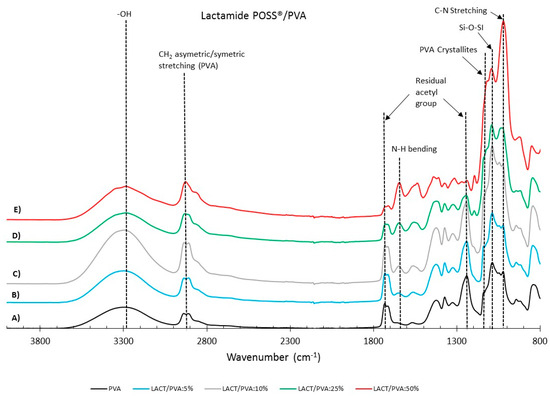 Figure 5. FTIR reflectance of (A) pure PVA, Lactamide POSS®/PVA: (B) 5%; (C)10%; (D) 25%; (E) 50%. The curves are shifted vertically for clarity.