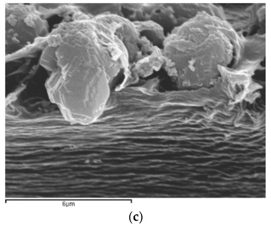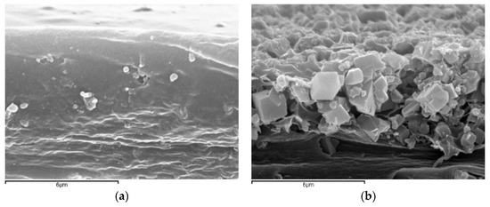 Figure 1 shows the high magnification scanning electron microscope (SEM) images of 5 wt % CHA, LTA, and RHO/PTMSP MMMs. As reported in a previous work [18], the smaller LTA particles are dispersed throughout the whole membrane thickness, of which a small glimpse can be seen in Figure 1a, while the larger CHA and RHO zeolites form a bottom layer of particles bound together by the polymer, as observed in Figure 1b for a CHA/PTMSP MMM. In the case of RHO, this adhesion is so strong that individual crystals are not easily discerned in Figure 1c. In this work, we want to focus on the compatibility and adhesion between the filler and the polymer, as the main challenge in MMM fabrication [34,35], thus it is important to notice in Figure 1 that even the largest particles at the bottom of the membrane are apparently well adhered with the polymer continuous matrix.