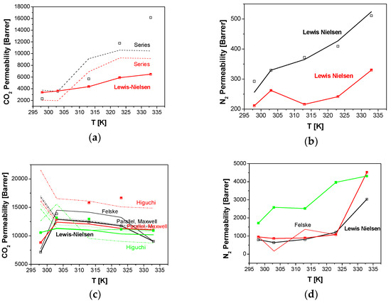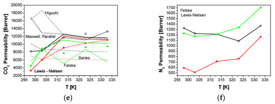 Only the model predictions with AARE lower than 20% are represented in Figure 2, for clarification purposes. The original Maxwell equation overestimates the experimental value for the permeability of all gases and membranes, especially for N2 permeability. This overestimation is more significant at lower operation temperatures, as reported by Clarizia et al. [14]. In this work, this is true for CHA/PTMSP MMMs with the series model, Figure 2a, and the parallel and Maxwell model for LTA/PTMSP MMMs, Figure 2c. These are simplifications of the general Maxwell equation expressed by Equation (B1) to predict the overall steady-state permeability through an ideal defect-free MMM [26]. Those models provide a simple, quantitative framework to predict the transport properties of MMM when the transport properties of the constituent phases are known, especially at low dispersed phase loading. Only more advanced modifications of this Maxwell equation, such as Felske and Lewis–Nielsen, provide enough accuracy for the description of MMM performance, especially in the case of the slow permeating gas, N2, as reflected in Figure 2b,d,f.