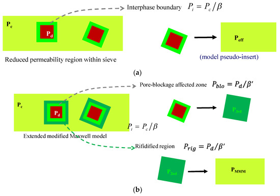 According to the reduced mobility modified Maxwell model, the effective permeability through the pseudo-insert in Figure 3a, Peff, is calculated first by