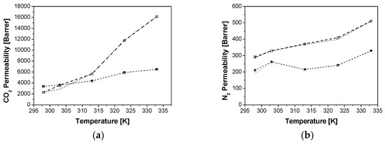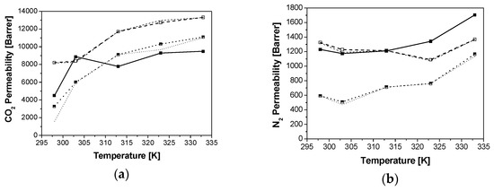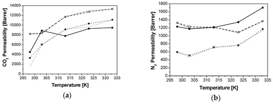 Effect of temperature and zeolite loading on the CO2 (a) and N2 (b) permeability through RHO/PTMSP MMMs: Thin lines correspond to the reduced mobility modified model and thick lines to the extended modified Maxwell model. Dash, dot and continuous patterns, and void, half-filled and full symbols, refer to 5 wt %, 10 wt % and 20 wt % zeolite loading, respectively.