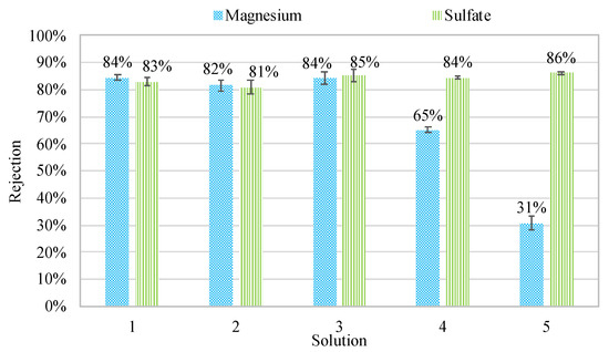 Figure 2. Magnesium and sulfate rejection variations for each solution.