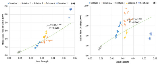 Figure 3 portrays the relationship between solute flux and feed ionic strength, showing increases in ionic strength had a strong non-linear correlation with magnesium passage. Conversely, sulfate flux did not appear to be correlated with ionic strength in the range investigated, as indicated by the low R-squared value. This difference suggested that the charge rejection characteristics of the membrane were affected by the higher ionic strength in the feed solution. These findings can also be observed when comparing the rejection of the solutes, as presented in Figure 4. Elevating the ionic strength significantly affected the rejection of magnesium but had little effect on the transport of sulfate across the membrane. This has been observed by Nanda and researchers [20] and was attributed to the Donnan effect. As a result, the modeling efforts presented in this work were focused specifically on the strong influence of ionic strength on magnesium diffusion.