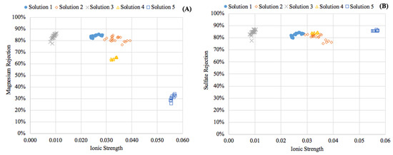 Figure 4. Effect of ionic strength on ion removal. (A) Magnesium; (B) Sulfate.