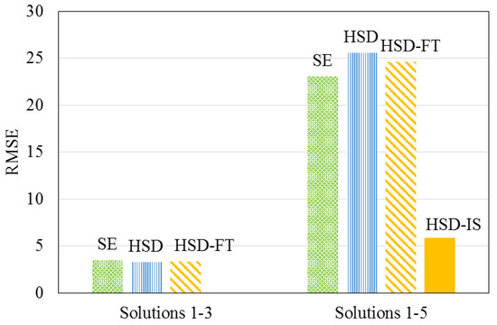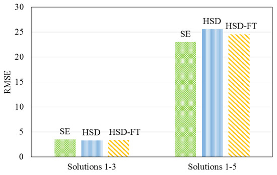 Traditional size- and diffusion-based models were investigated in this research, including the size exclusion (SE) [26,27], HSD, and HSD-FT models to describe the data collected when testing solutions 1–5. Figure 6 displays the root mean square error (RMSE) for each model, describing the permeate magnesium concentration using experimental data from solutions 1–3 and solutions 1–5. The RMSE and residual sum of squares (SS) for each of the existing descriptive models were shown to increase, indicating that the addition of solutions 4 and 5 caused the existing models to become less accurate.