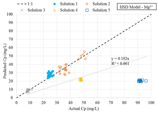 Figure 7. Predicted versus actual magnesium permeate concentrations using homogeneous solution diffusion (HSD) model.