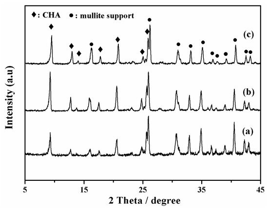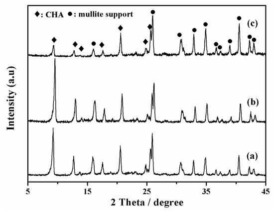 XRD patterns of high silica SSZ-13 zeolite membranes with different SiO2/Al2O3 ratio; (a) M-1, SiO2/Al2O3 = 40; (b) M-2, SiO2/Al2O3 =200; (c) M-3, SiO2/Al2O3 = ∞.