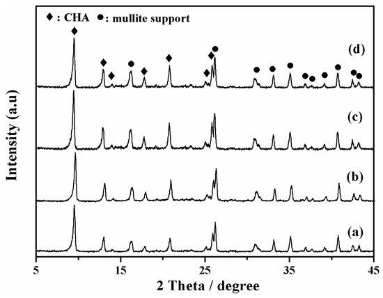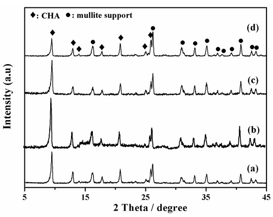 XRD patterns of high silica SSZ-13 zeolite membranes with different H2O/SiO2 ratio, (a) M-4, H2O/SiO2 = 20; (b) M-5, H2O/SiO2 = 40; (c) M-6, H2O/SiO2 = 60; (d,b) M-3, H2O/SiO2 = 80.