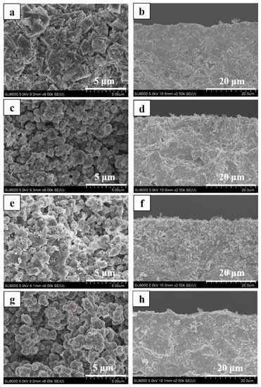 Surface and cross-sectional SEM images of high silica SSZ-13 zeolite membranes with different H2O/SiO2 ratio, (a,b) M-4, H2O/SiO2 = 20; (c,d) 40, H2O/SiO2 = 40; (e,f) M-6, H2O/SiO2 = 60; (g,h) M-3, H2O/SiO2 = 80.