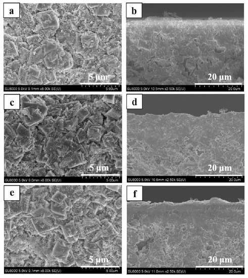 Surface and cross-sectional SEM images of high silica SSZ-13 zeolite membranes with different SiO2/Al2O3 ratio (a,b) M-1, SiO2/Al2O3 = 40; (c,d) M-2, SiO2/Al2O3 =200; (e,f) M-3, SiO2/Al2O3 = ∞.