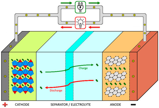 The main components of a battery are the anode, the cathode, and the separator, which are represented in Figure 1, together with the working principle of a lithium ion battery.