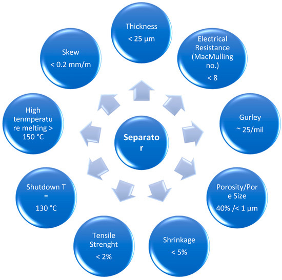 Separators play a key role in the operation of electrochemical devices. The main purpose of the separator membranes is to separate the cathode from the anode, avoiding the occurrence of short circuits, and controlling to the mobility of lithium ions between electrodes. The performance of a separator in a lithium ion battery is determined by some requirements such as porosity, chemical and thermal stability, electrical insulator, wettability, dimensional stability, and resistance to degradation by chemical reagents and electrolytes (Figure 2) [9]. Figure 2 shows the ideal values for the main requirements of a separator membrane.