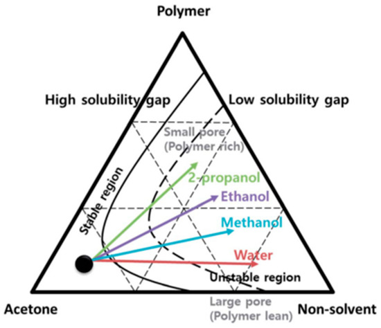 Phase diagram of the ternary mixture—PVDF–HFP, acetone, and non-solvent—in order to control PVDF-HFP membrane morphology [46], with copyright permission from the Royal Society of Chemistry.