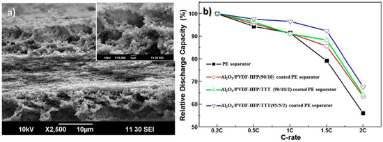 (a) Cross-section scanning electron microscopy (SEM) images of the γ-Al2O3/PVDF-HFP/TTT(95/5/2)- coated PE separator and (b) relative discharge capacities as a function of the C-rate [13], with copyright permission from Elsevier.