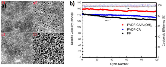 The dip-coating of a PE separator with γ-Al2O3/PVDF-HFP/TTT, proved to increase electrolyte uptake and ionic conductivity when compared with conventional membranes, as shown in Figure 5 where its microstructure and cycling performance are presented. The discharge performance was also enhanced as well as the thermal resistance [13].