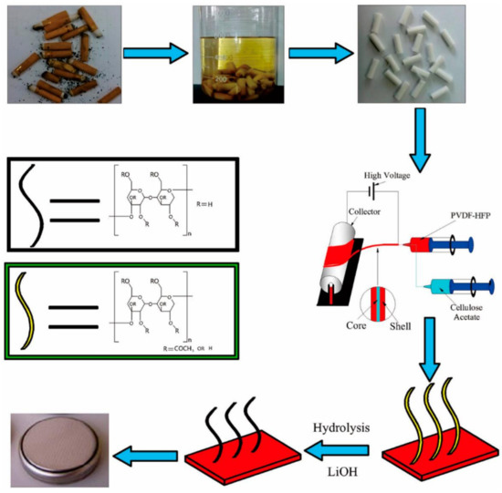 - Huang, F.; Xu, Y.; Peng, B.; Su, Y.; Jiang, F.; Hsieh, Y.-L.; Wei, Q. Coaxial electrospun cellulose-core fluoropolymer-shell fibrous membrane from recycled cigarette filter as separator for high performance lithium-ion battery. ACS Sustain. Chem. Eng. 2015, 3, 932–940. [Google Scholar] [CrossRef]