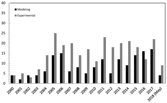 Regarding the oscillation of the number of works per year for both modelling and experimental approaches, we believe that an experimental study may offer more opportunities for an original contribution due to new catalysts utilization and integration in a MR, new membranes tested, and so on. Otherwise, as also reported in Section 3, most of the simulations about the MSR reaction in MRs are one-dimensional (1-D) based, assuming full H2 perm-selectivity for the palladium membranes. This—in our opinion—limited the number of original contributions in this field and only recently the development of simulations using two-dimensional (2-D) and three-dimensional (3-D) models made an increase of new and original works about modelling of MSR reaction in MRs possible, as confirmed by a higher number of modelling papers than the experimental ones in 2016.