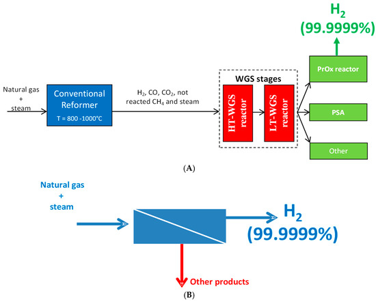 As an example of PIS pursued by MRs, the production of high grade hydrogen from natural gas steam reforming reaction (the first source of hydrogen production at industrial scale [30]) is conventionally realized by means of a multi-stages process, Figure 3A; on the contrary, the utilization of a MR housing a hydrogen perm-selective membrane makes the combination of the reaction process for generating hydrogen and its purification in a single device without needing further hydrogen separation stages possible, Figure 3B.