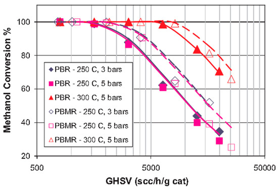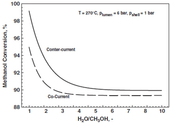 Gallucci and Basile [52] compared the performance of a MR with respect to the equivalent conventional reactor, while adopting a 1-D numerical model. A Runge-Kutta solution method was developed, including as reaction rate equations those of Peppley et al. [57], meanwhile comparing two different flow patterns (co-current and counter-current modality). These authors theoretically demonstrated that such parameters as reaction temperature, pressure, and feed molar ratio strongly affect positively the hydrogen production, while the adoption of the counter-current configuration is responsible of higher methanol conversions, Figure 5.
