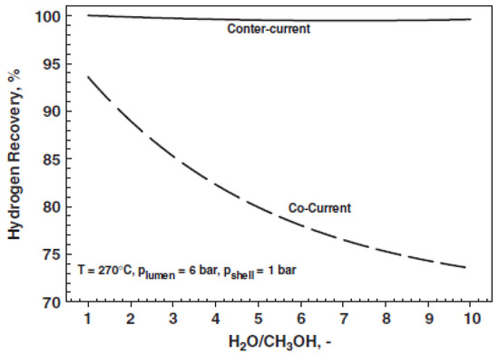 In detail, the model predicted that, with a H2O/MeOH ratio equal to 1/1 and at 270 °C and 6 bar, 99.5% methanol conversion may be reached in counter-current modality against 95% obtained with co-current mode adoption. Furthermore, the counter-current configuration acts positively on the hydrogen recovery, which is almost 100% in the whole range of feed ratio investigated. On the contrary, the co-current configuration is responsible for the decreasing trend of the hydrogen recovered in the permeate stream by increasing the feed ratio, Figure 6.