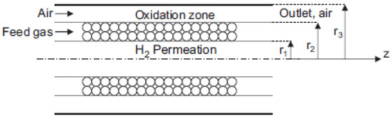 Fu and Wu [54,55] modeled the MSR reaction by using a double-jacketed Pd-based MR, while also considering a non-isothermal numerical model. The schematic diagram of the MR used by Wu and Wu [54] is shown in Figure 7, which illustrates that, from the external to the internal layer, three components are placed: the catalytic combustor, the reformer, and the permeator.
