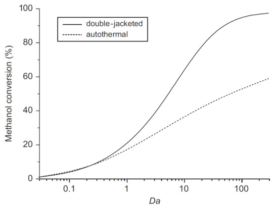 Methanol conversion vs Damköhler number: comparison between the double-jacketed MR and an equivalent autothermal conventional reactor. With permission of reprint of Elsevier from Wu and Fu [54].