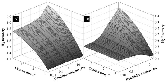 Simulation results of MSR reaction: Hydrogen recovery vs. contact time and Damköhler number: (A) carbon molecular sieve (CMS) MR, (B) Pd MR. With permission of reprint of Elsevier from Sà et al. [48].