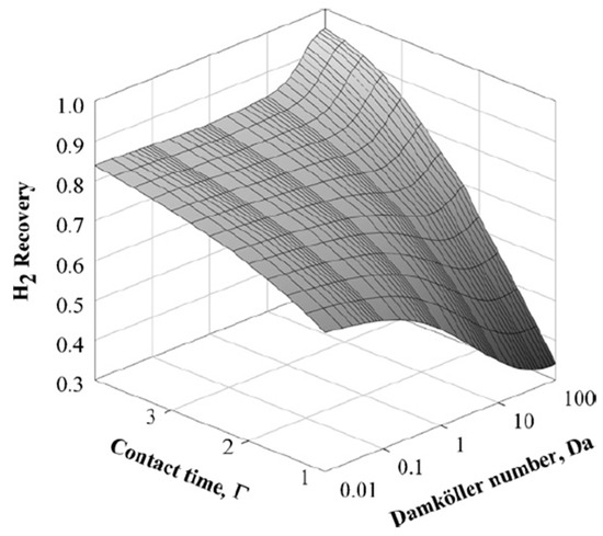 Simulation results of MSR reaction: Hydrogen recovery vs contact time and Damköhler number for a hybrid MR solution. With permission of reprint of Elsevier from Sà et al. [48].