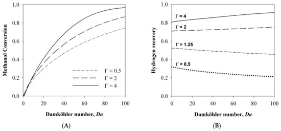 The hydrogen recovery is enhanced in both the MRs by increasing the Damköhler number. However, the Sà et al. [48] confirmed that the adoption of a Pd-based MR is more adequate if high grade hydrogen has to be produced because the simulations demonstrated that the H2/CO reaction selectivity is increased by using this reactor with respect to the CMS-MR.