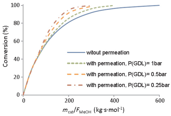Housing a Pd-based membrane in a MR, the enhancement of the reaction conversion with respect to the equivalent conventional reactor is promoted by the so-called “shift effect” [41]. Indeed, the hydrogen perm-selectivity characteristics of Pd-based membranes allow for the enhancement of conversion due to the hydrogen removal from the reaction toward the shell side.