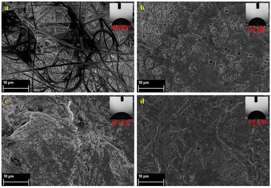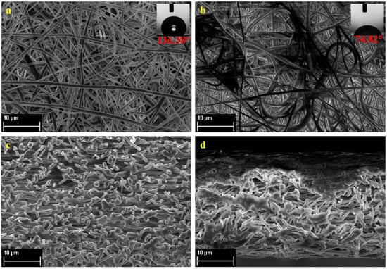 Prior to IP, the PVDF-PAA nanofiber mats were subjected to LbL approach by immersion of the nanofiber mat surface in electrolytic solutions, 0.5 wt % PEI and 0.5 wt % PAA, both in 0.5 M NaOH, which carry the positive and negative charges, respectively. Figure 3a shows the PVDF-PAA nanofiber prior to LbL. Due to the negative charge of PAA, the nanofiber mat was first immersed in positively-charged PEI to form a neutrally-charged layer. The reaction of the carboxylic acid groups of PAA and the amino groups of PEI react together electrostatically and due to the presence of H-bonds [36]. Figure 3b shows the first layer of the PAA and PEI. The contact angle of the nanofiber mat after the immersion with PEI increased to 74.38°, indicating the slightly hydrophobic character of polyamide. Based on Figure 3b, the surface of the nanofiber still exhibited the presence of pores and non-uniform coating, thus another deposition cycle of both PAA and PEI was performed, resulting to the nanofiber mats whose morphologies are shown in Figure 3c,d. After two deposition cycles of PAA and PEI, formation of two polyelectrolyte layers ensures a more uniform coating on the nanofiber support, which was then proceeded for the IP process to form the polyamide selective layer. The final PVDF-LbL support exhibited a final surface contact angle of 72.19°, indicating highly satisfactory hydrophilicity.