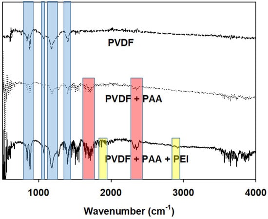 The FTIR spectra of the plain PVDF nanofibers, PVDF/PAA nanofibers, and PVDF/PAA nanofiber with the polyelectrolyte mat with PAA and PEI deposition.