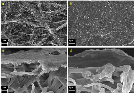 FESEM images (Figure 5a,b) show the surface morphology of the PVDF TFC and PVDF-LbL TFC membranes. Typical ridge-and-valley structures of polyamide were shown by both the membrane samples, indicating that polyamide was formed well onto the nanofiber mat. The difference observed for the samples, however, is that, for PVDF TFC membrane, the structure of the nanofiber surface was clearly visible beneath the polyamide layer of the PVDF TFC membrane, which was not observed with the PVDF-LbL TFC membrane. This shows that the uniform coating and deposition of PAA and PEI layers have occurred for the latter. Cross-section images (Figure 5c,d) of the TFC membranes show that for PVDF TFC membrane, the polyamide layer is directly on top of the nanofibers, while two layers can be seen on top of the nanofibers of PVDF-LbL TFC membrane, corresponding to the polyelectrolyte and polyamide layers.