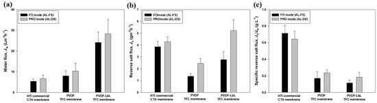 Membrane performance for FO operation of the (a) PVDF TFC membrane; (b) PVDF-LbL TFC membrane; and (c) commercial CTA membrane at FO (AL-FS, i.e., active layer facing the feed solution) and PRO (AL-DS, i.e., active layer facing the draw solution) modes with 0.5 M NaCl and DI water as the draw and feed solutions, respectively.