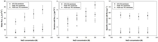 Membrane performance for FO operation of the PVDF TFC membrane, PVDF-LbL TFC membrane and commercial CTA membrane at different concentrations of NaCl (0.5–2.0 M) as draw solution and DI water as feed solution.