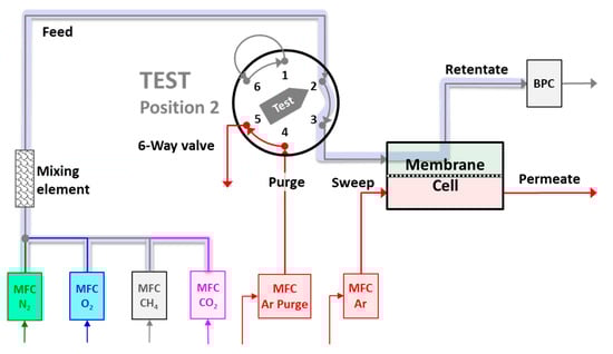 A limitation of the previous work is that the instrument was set up for the analysis of mixed gas permeation transient measurements at atmospheric feed pressure [35]. However, since real separations are always performed at higher pressures to provide the desired driving force, knowledge of the response of the system under such conditions is very important. This response is fundamentally different, as can be seen from the schematic image of the feed section of the instrument in Figure 3. The response time for switching from argon to the feed gas at atmospheric conditions is dictated only by the ratio of the feed flow rate and the very small volume between the six-way valve at point 3 and the membrane cell. In contrast, the response at higher pressures depends on the entire pipe volume from the mass flow controllers (MFCs) until the back pressure controller (BPC).