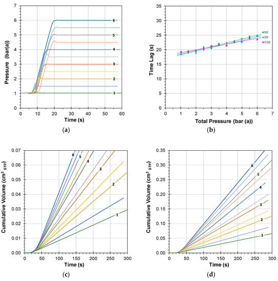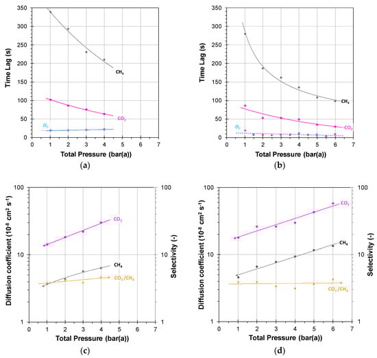 Unlike the average residence time in the tubes and other volumes in the setup that contributes for 100% to the instrumental time lag (Equation (7)), the time needed for the pressure increase contributes less to the overall time lag because permeation already starts before the maximum pressure is reached. Indeed, Figure 4b shows that for higher feed pressures, the time lag increases only 6–7 s. This is a small, but significant, contribution, considering that the standard deviation in the time lag measurements is in the order of 2 s [35]. The apparent difference in the trend of O2, N2, and CO2 is most likely due to the different flow regime in the narrow sampling capillary and in the low pressure quadrupole inlet, where Knudsen diffusion plays a role. This difference is negligible compared to the membrane-related time lag (Figure 5a,b), and since it falls more or less within the range of the experimental error, it does not affect any of the conclusions.