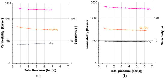 The above procedure was applied to measure the permeation transient and steady state of CO2/CH4 mixtures in PIM-SBF-1 at different pressures, and the results are given in Figure 5. All experiments were performed on a well-aged sample (2088 days) to avoid time-dependent phenomena. At high feed flow rates of 500 cm3 min−1, the feed pressure during permeation experiments at 1–4 bar still requires 10–15 s to reach the setpoint value (SI Figure S4a). This time is not negligible and contributes, to some extent, to the overall time lag. Figure 5a shows the measured overall individual time lags for CO2 and CH4, and the instrumental time lag, measured with the TFC membrane of SBS, is plotted for comparison as the lower blue line in Figure 5a. For a similar problem in gravimetric sorption measurements, where significant time is needed to fill the sorption chamber, Vopička et al. proposed a mathematical correction of the model [40]. In the present work, we assume additivity of each characteristic time in the procedure. Therefore, we subtract the time lag for the TFC membranes from that of CO2 and CH4 at the same pressure. Rearranging of Equation (12) then allows for the calculation of the diffusion coefficient (Figure 5c) of each gas according to: